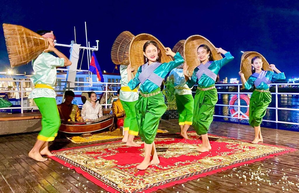 The sunset arrival into Cambodia’s capital, Phnom Penh, adds another dimension to the day, and the traditional ‘Apsara’ Khmer musical dance performance in the lounge rounds out the evening.
