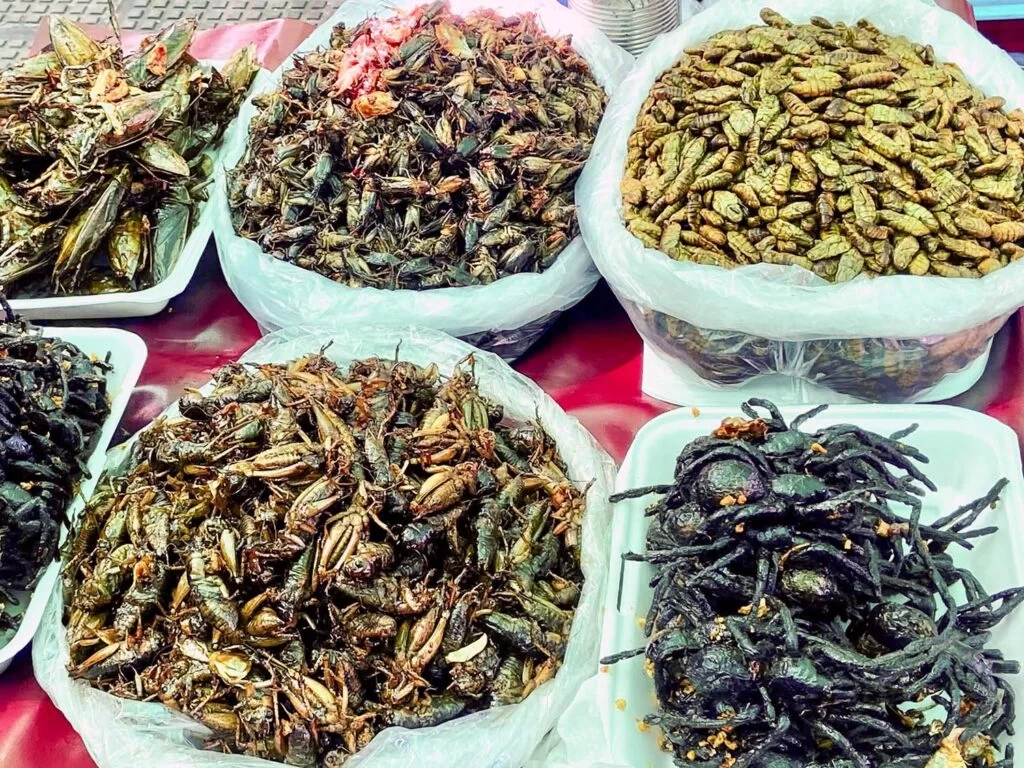 That afternoon, an air-conditioned van transports us to Cambodia’s former capital, Oudong, where we stroll through the local market. It’s a true ‘local’ market. We are the only white people around. Exploring markets in any country always provides interesting insights, but the Oudong market is a real eye-opener. Fancy a stuffed frog for entrée? Snakehead fish for main and red ants with banana for dessert? Luckily, my delicious TT2 lunch has curbed any hunger pangs.