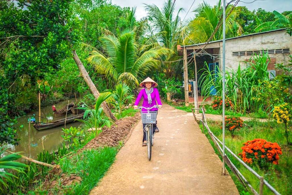 Once again, our outing was void of other tourists. Cai Be and Tan Phong islet is enveloped by the Tien River and crisscrossed with canals and lush fruit plantations. Residents mostly farm jackfruit, longan, guava, rambutans, mangosteens, durians, and other tropical fruits and narrow lanes led the bike riders between these and a colourful array of flowering foliage, providing a firsthand glimpse into the locals’ lives.