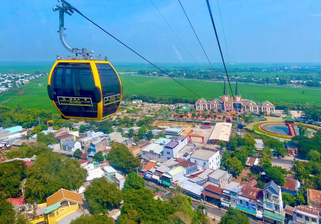 The expansive glass cable car cabins on the 900m ride to the peak provide 360-degree views of the picturesque patchwork farming countryside and town below. The mountain’s steep slopes are dotted with pagodas, temples and caves. The most famous and sacred is Ba Chua Xu Pagoda. At the top, Chua Hang (Cave Pagoda) offers breathtaking panoramic views of Vinh Te Canal, stretching all the way to the Cambodian border.