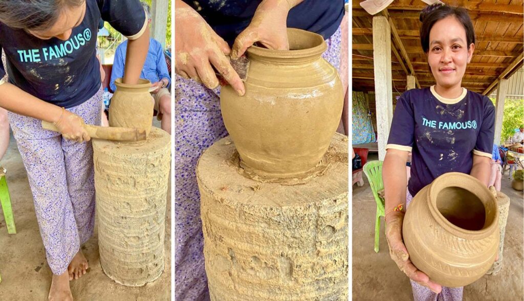 There were no electric or even foot-peddled potter wheels in sight. Sophat, the 30-year-old female potter, got her steps up by walking around and around a solid tree stump as she miraculously patted the clay with her hands and a paddle until she crafted a perfect pot for us by hand.