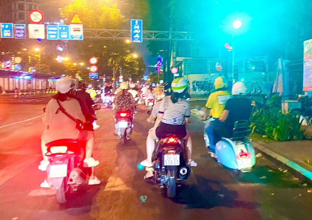 Bang on sunset, we cruise into lively HCMC, docking just far enough away from the line of brightly lit dinner cruise boats that their activities do not disturb us. Tonight, five of us have chosen the additional Vespa Nightlife Food Tour (at US$120 pp). And the little bright two-wheel vintage machines (1950 era) and our drivers (mature and sensible) were waiting.